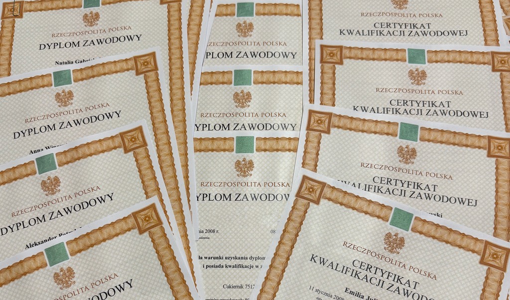 - dyplom zawodowy w zawodzie nauczanym na poziomie technika albo świadectwa potwierdzające kwalifikacje w zawodzie (wyłącznie lub łączone ze świadectwem czeladniczym) ze wszystkich kwalifikacji wyodrębnionych w danym zawodzie nauczanym na poziomie technika albo