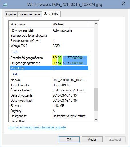 Odczytanie ich jest dość proste – wystarczy, że w Windowsie klikniemy prawym przyciskiem myszy na zdjęciu zawierającym
